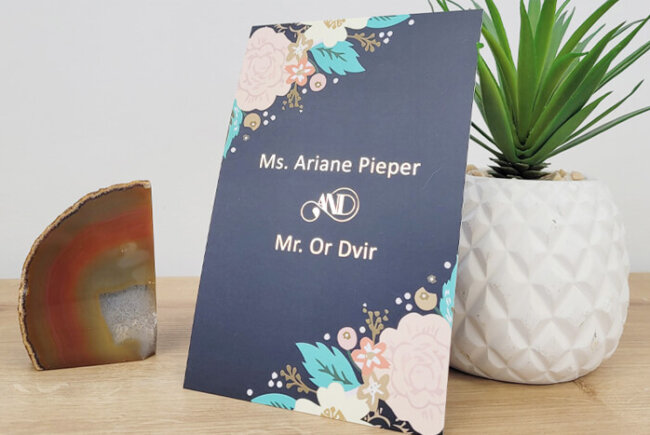 הזמנות עם פויל רקע כהה עם פרחים נכנס לקווי הייצור הרובוטיים של One Print לקבלת גימור מושלם בכל פרט קטן. חומרי גלם פרימיום מבטיחים צבעוניות עשירה ועמידות לאורך זמן. אפשרות לגימורים מיוחדים לפי דרישה. מוזמן ליצור קשר לייעוץ חינמי, הדגמה חיה ומשלוח מהיר במיוחד.